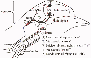 En 1976, Fernando Nottebohm, especialista en conducta animal y neurogenesis de la Universidad de Rockefeller, NY, U.S.A., identificó grupos de células cerebrales diferenciadas que controlaban el canto de los canarios. Estas células se distribuyen en un núcleo mayor, llamado “centro vocal superior” (CVS), que envía prolongaciones axonales a otro núcleo llamado centro “robustus archistriatalis” (RA); éste ,a su vez, envía otras prolongaciones axonales al núcleo del “nervio craneal hipogloso” que inerva los músculos de la siringe.