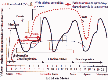 Superposición del numero de sílabas aprendidas por mes, tamaño del centro vocal superior (CVS) regulador del canto y los niveles de testosterona en sangre. Durante la canción plástica o “periodo crítico” de aprendizaje del pollo se observan niveles bajos de testosterona: tras un descenso inicial muy pronunciado de esta en la primera mitad (mayo a junio) aparece la “muda” y se estanca el crecimiento del temario del CVS; luego se produce una recuperación progresiva durante la segunda mitad (agosto a octubre); en esta segunda mitad, coinciden un aumento espectacular del tamaño del CVS por un fenómeno de neurogenesis, una capacidad máxima de aprendizaje y una recuperación de los niveles de testosterona, hasta adquirir niveles máximos en noviembre.